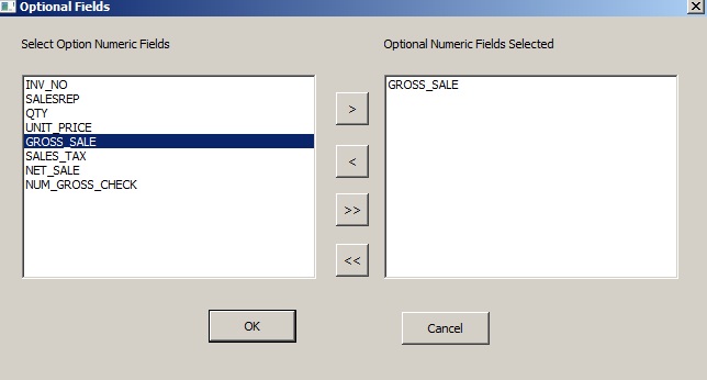 In the GEL-1 results for the above example, the user decided to further analyse all GEL factors of .6000 and greater. Salesrep 105 falls into this criteria with a GEL factor of .7500 and is used in the GEL-2 test. The user is also interest in determining the total Gross_Sale amount for each of the customers that dealt with Salesrep 105. Gross_Sale is then selected as the Optional field to total which will be displayed in the resulting file.