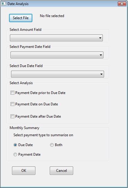 There are three ways to analyze the file and you can perform one, two or three of these at the same time. The first has analysis as the first date field less than the second, the next has both date fields equal and the third as the first date field greater than the first. Each analysis will create its own IDEA file. The files will then be summarzied by year and month based on the due date, payment date or both.